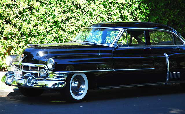 This may have been parked here by the park in Beverly Hills since the year Frank Sinatra began recording at Capitol Records up in Hollywood, the year Elvis Presley recorded for the first time as a kid back in Nashville. That would be 1953, and this is a 1953 Cadillac sedan, in formal black, parked in the shade not far from Beverly Hills City Hall. It hasn't been restored or anything – it hasn't even been washed. Perhaps there's a rift in the space-time continuum nearby, and of course this Cadillac just popped through for the moment.