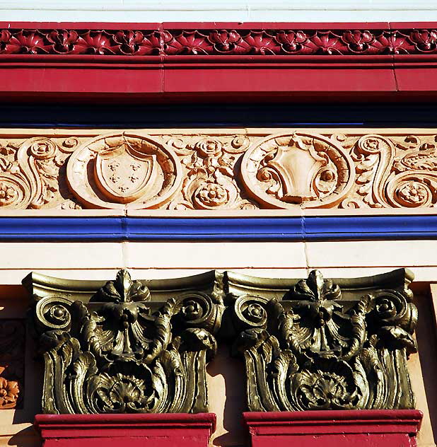 Across the street is the famous Chinese Theater, which opened on May 18, 1927, with the premiere of Cecil B. DeMille's King of Kings – and there's a major premiere here most every week, and there are all those stars' footprints in the cement in the courtyard. But no one pays attention to the architectural detailing. The principal architect was Raymond M. Kennedy, of Meyer and Holler. He had fun with this.