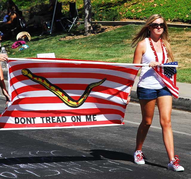 The 2009 Fourth of July parade in Rancho Bernardo, California – inland San Diego County, between Camp Pendleton just to the north – the Marines, their center on the West Coast – and San Diego to the south, with its massive Navy base – the area is politically conservative (solid Republican) and intensely and militantly patriotic. There are flags everywhere.