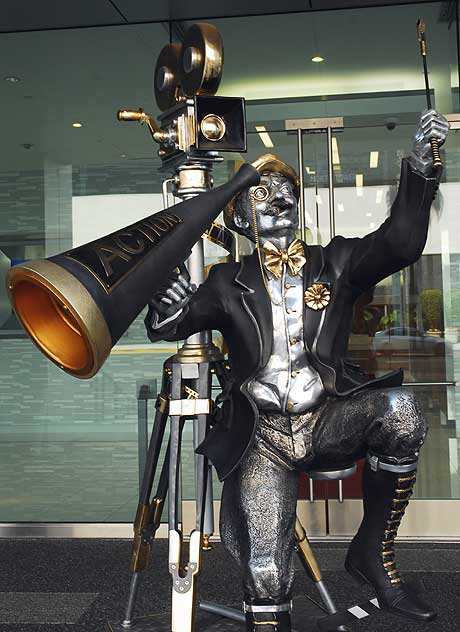 This Hollywood Director stands in front of the Luckman Plaza on the Sunset Strip, just where the Strip blends into Beverly Hills. It's "Going for Gold" by the Israeli sculptor Frank Meisler. Frank Meisler was born in Danzig, educated in England and graduated in Architecture at Manchester University, and now his home and studio are in the Artist’s Quarter of the Old City of Jaffa. In 1999, the Czech Academy of Art awarded him the Franz Kafka Gold Medal for Artistic Achievement. It figures. His doctor is across the street – but this is Hollywood. Lights! Camera! Action!