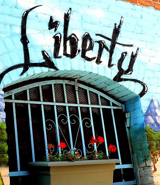 Somewhere between street art and commercial art, or maybe folk art, the mural at Liberty Bell Temple (Member of United Cannabis Ministries) – in the alley beside their "temple" at 5642 Hollywood Boulevard, at edge of Thai Town. The alley leads to the west coast studios of Cirque du Soleil, if you want to audition.