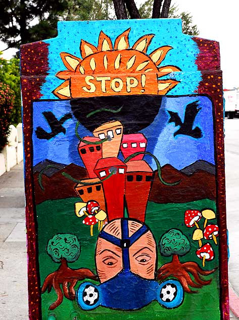 A utility box on Hollywood Boulevard at New Hampshire Avenue in East Hollywood, between Thai Town and Los Feliz, across the street from the Frank Lloyd Wright Hollyhock House and the shopping center that was built on the site where D. W. Griffith built the Babylon set for Intolerance: Love's Struggle through the Ages (1916) – the local Chamber of Commerce has commissioned local artists to interpret Hollywood. This is one of the best, between a public school and the Christian Science Reading Room – playful and darkly surreal at the same time.