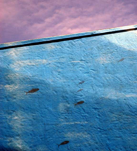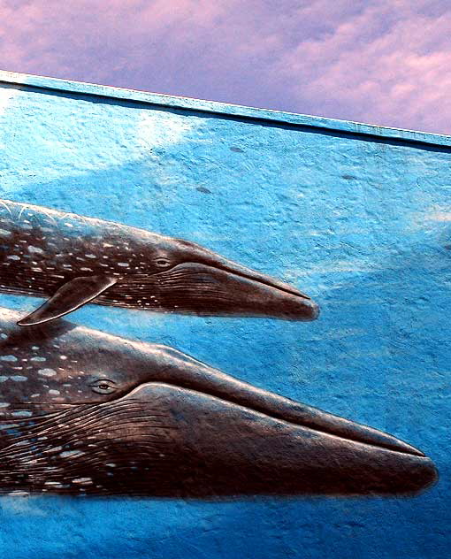 Whales! These are on the west wall of the giant soundstages at Paramount Studios, the soundstages on Gower Street that used to be RKO and then Desilu Studios. The mural is from "Wyland" and may have to do with Star Trek – the television show and all its variants were filmed behind this wall, along with all the Star Trek movies. You might remember the 1986 movie Star Trek: The Voyage Home – to save Earth from an alien probe, Kirk and his crew go back in time to retrieve the only beings who can communicate with it, humpback whales. It was a comedy, and it won two Oscars – Best Cinematography and Best Effects, Sound Effects Editing.
