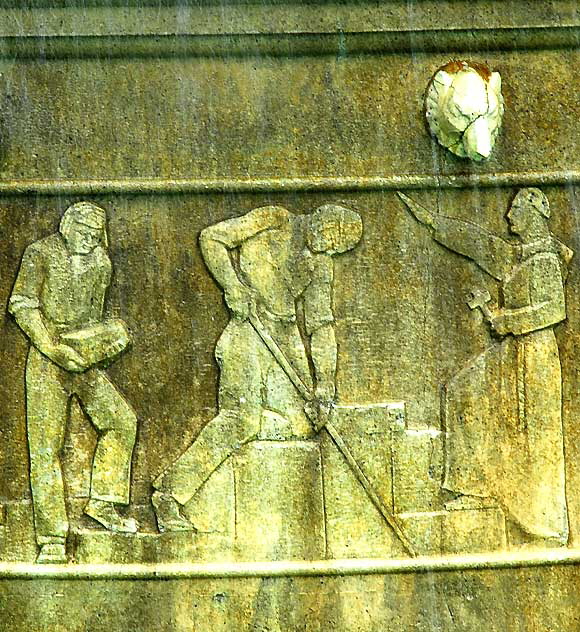 You only notice it on dark, moody days. This is the Electric Fountain – from 1931 – on the corner of Wilshire and Santa Monica Boulevards, one of the busiest intersections in the world. The plaza and fountain are the work of the architect Ralph Carlin Flewelling and the sculpture is by Robert Merrell Gage (more here). No one pays attention to it when it's sunny. It spooks you when it's not