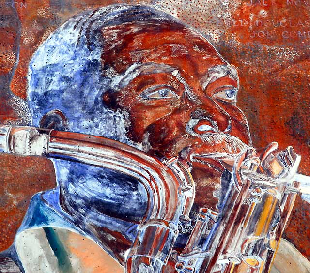 And, by way of contrast, one short block east, at Yucca and Vine, in the parking lot behind the Capitol Records Building, there's the Richard Wyatt mural "Hollywood Jazz: 1945-1972" –