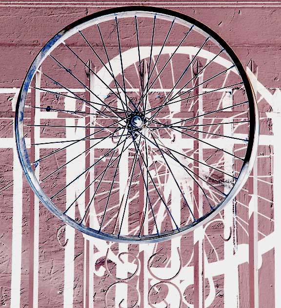 Bicycle wheel on wall of repair shop near Heliotrope and Melrose