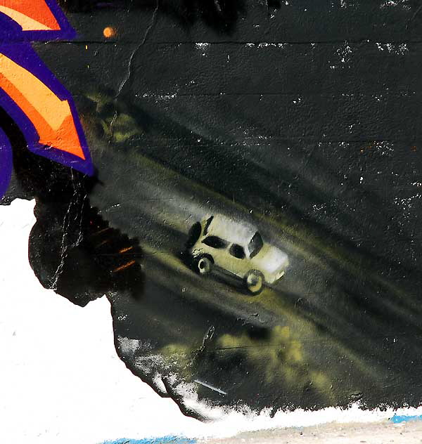 The just completed "Los Angeles Crimes" mural from the CBS (Can't Be Stopped) Crew – in the alley behind the Jiffy Lube at La Brea and Melrose – and the font is from the Los Angeles Times of course. Out here we all know what this is about – Rodney King, OJ's Bronco, police dogs – it explains itself. Some wounds do not heal.