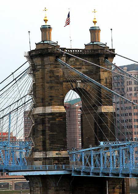 To the right, the John A. Roebling Suspension Bridge across the Ohio River between Cincinnati and Covington, Kentucky. When the first pedestrians crossed on December 1, 1866, this was the longest suspension bridge in the world until the 1883 completion of the Brooklyn Bridge also by Roebling. Read all about it here they started building it ten years earlier, but the Civil War slowed construction. This was the first bridge to use both vertical suspenders and diagonal stays fanning from each of its big stone towers, so it served as the prototype for Roebling's design of the Brooklyn Bridge. Cincinnati sort of has the original bridge, just smaller.