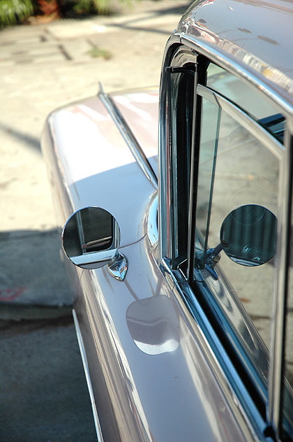 Metal work - the shape of America in its glory days - a classic Cadillac on the lot at Frank Corrente Classic Cars on Sunset Boulevard in Hollywood. Actually, it's Frank Corrente's Cadillac Corner at 7614 Sunset - as featured in a Sports Illustrated video ("Watch Swimsuit Model Yesica Toscanini in her photo shoot at Frank Corrente's Cadillac Corner!"). This is a 1959 Cadillac Sedan Deville with the original "Woodrose" exterior, and inside, the original rose "Coronado" cloth with rose metallic leather trim. Wow. But the website says it's been sold, so you can't have it.