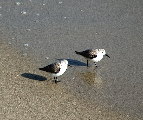 On the beach between Topanga State Beach and the Malibu Pier - chicks on the beach - The Gang of Seven, if you will - Friday, March 9, about 3:30 in the afternoon. The heavy traffic roaring by on Pacific Coast Highway above them doesn't seem to bother these guys at all. Actually, a good friend points out these are not immature birds - they are winter-plumage birds - Sanderlings (a species of sandpiper). "Sanderling is the familiar 'clockwork toy' bird seen chasing waves on sandy beaches." - Sibley Guide to Birds |
