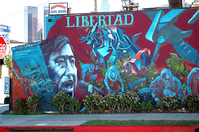 Then something jumps out at you - the 2004 mural by Victor M. Quiñonez - who works under the name Marka 27 - on the southwest corner of Glendale and Colton, in the scruffy area just north of downtown Los Angeles.