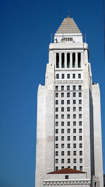 Oh, yeah – the famous façade, Los Angeles City Hall - designed by John Parkinson, John C. Austin, and Albert C. Martin, and completed in 1928. Until 1964 it was the tallest building in Los Angeles – the concrete in its tower was made with sand from each of California's fifty-eight counties and water from its twenty-one historic missions. And it wasn't really destroyed in the 1953 film version of War of the Worlds. Most of us remember it from the radio show that moved to television, Dragnet. The first show of the first season, "The Human Bomb," 16 December 1951, was filmed here, and building became a character on the show, always in the background. And it was embossed on Sergeant Joe Friday's famous badge, number 714, always displayed under the credits.
