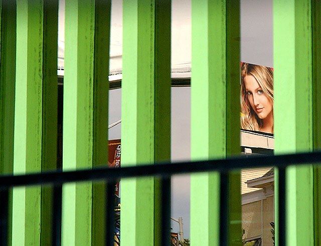 Advertizing image reflected in glass wall, round green stucco building, Sunset Strip
