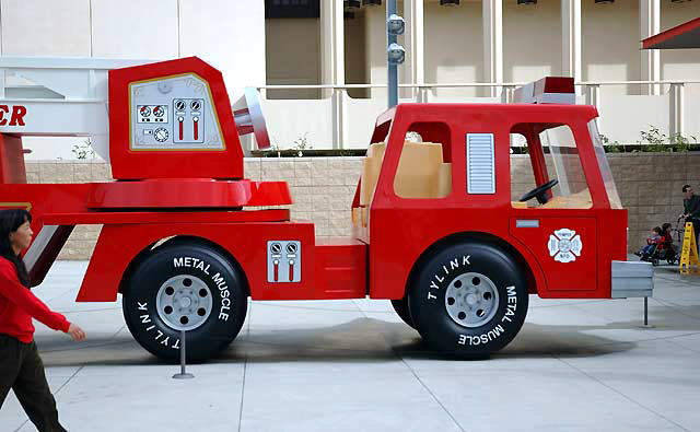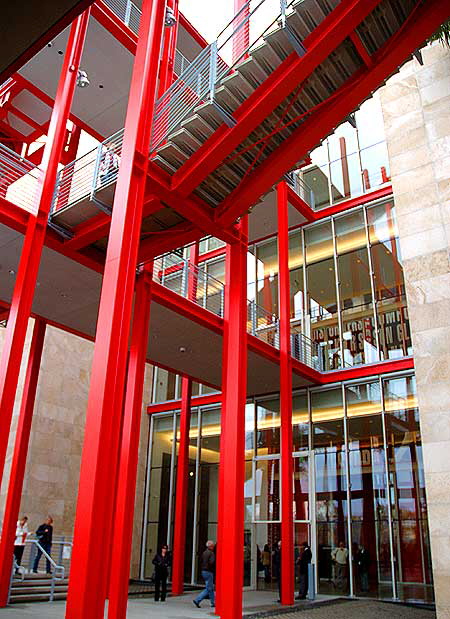 So now we get the new Broad Contemporary Art Museum that opened on February 16, 2008, at the Los Angeles County Museum of Art (LACMA) on Wilshire Boulevard. The building is by Renzo Piano, who gave us the famous inside-out Centre Pompidou in Paris and, in Manhattan, the just-completed New York Times building. This museum is all geometry, although Piano warms it up with all the grid work in Chinese red and the exterior clad in squares of Travertine marble that glows warmly in the sun. And it is being surrounded by tall Imperial palms, with their odd organic geometry. Like the Paris museum, this one is playful – as noted in the Los Angeles Times' review, you enter from the top and work your way down, but then many an IKEA store is set up the same way.