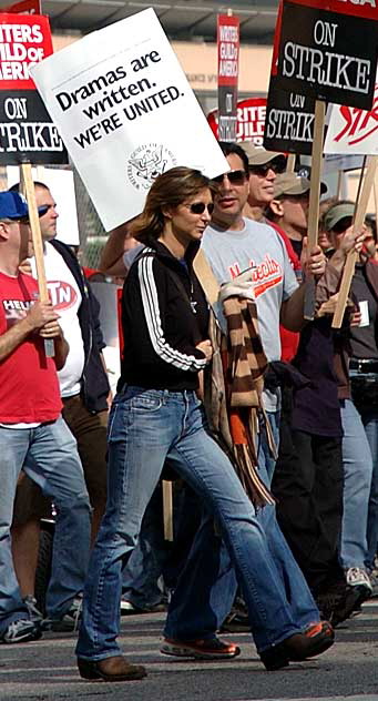 On August 27, 1950, President Truman ordered the Army to seize all the nation's railroads to prevent a general strike, and the railroads were not returned to their owners until two years later. This is not that dire - the Writers Guild of America, the screenwriters, are on strike, supported by the Screen Actors Guild and others. We'll have reruns on television, and new movies will be delayed. President Bush will not seize the studios. And strikes are a bit different out here. The scene at the main gate of 20th Century Fox, Pico and Motor –
