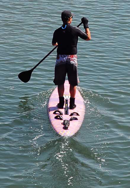 Man paddling surfboard, Naples Island, Alamitos Bay, Long Beach