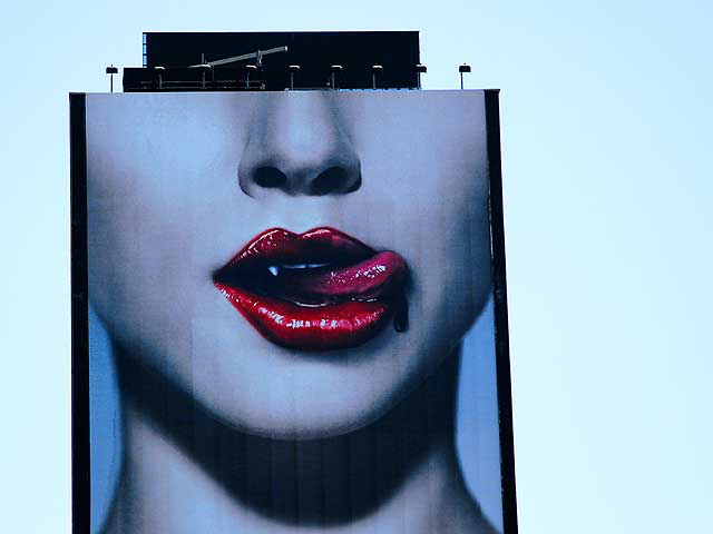 On the other side of Sunset, more red lips, having something to do with a new HBO show about vampires –