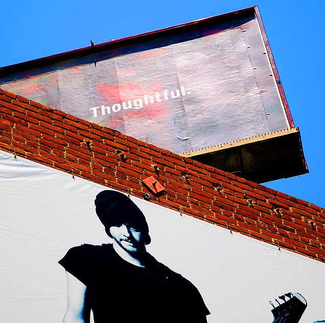 "Thoughtful" - a rock musician advertizing Converse shoes under a billboard for Forest Lawn's mortuary services - Hollywood
