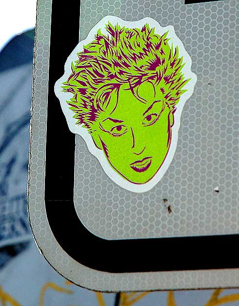 Sticker on street sign, at Harmony Gold, Sunset Boulevard at Stanley, Hollywood