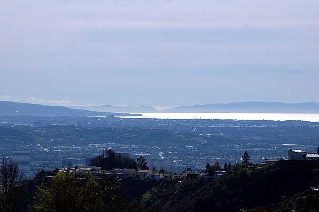 Just vistas – after a dark weekend of heavy rain (that happens every five or six years out here), things clear and the view from Mulholland Drive way up over Hollywood is pretty good. Looking south across the basin there's Hermosa Beach and the Palos Verdes peninsula poking out into the Pacific just across the water, and far in the distance, twenty-six miles across the sea, Catalina.  The notch in the island is Avalon – and as you recall, someone left their love in Avalon, across the sea.